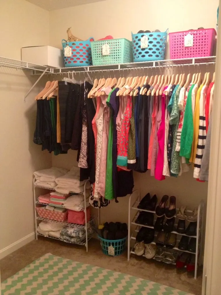 The metal white shelves are actually an old shoe rack.  I use the first shelf to hold towels while the second shelf has washcloths and hand towels.  The third shelf has a polka dot basket that holds extra toiletries like soap, shampoo, toothpaste, and toothbrushes. There is also a small bag that holds extra eyeshadow and other makeup that I don’t wear everyday.  I use the bottom shelf to hold sheets for my bed.