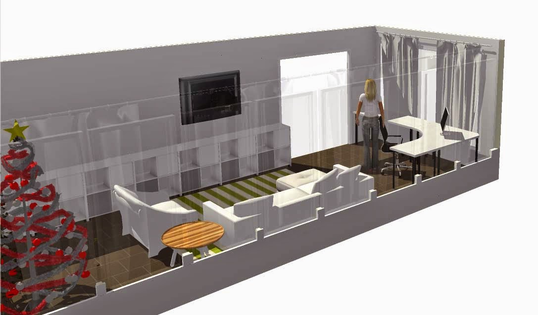 We’d like to add some bookcases along the wall across from the sofa. On these shelves, we could store TV equipment, toys, and office supplies. I’ve been nervous that it would feel too tight between the seating and the bookcases, but the combination of 2D and 3D angles helps me visualize how roomy it will still feel.